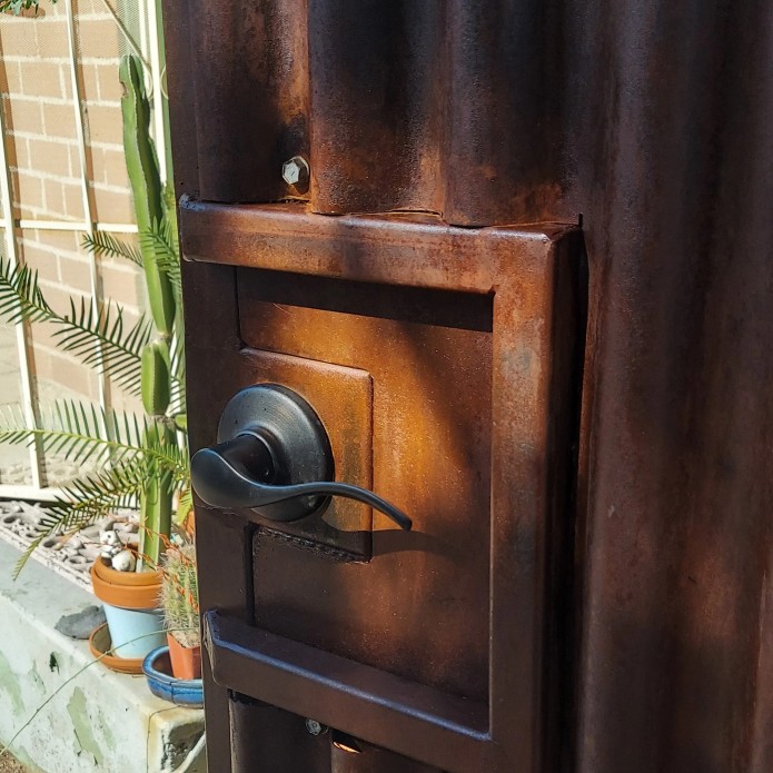 The Secret Door/BookcaseMobile Steel Fabrication and Fine WoodworkingBack Bar Restoration and Installation in Bisbee, AZ.High Volume Steel FabricationCustom Alder Dutch Door with Side Light, Mortise and Tenon JoineryMesquite and Steel Mantel Piece in the original Carly Quinn Designs showroom.Steel Gate closeup.